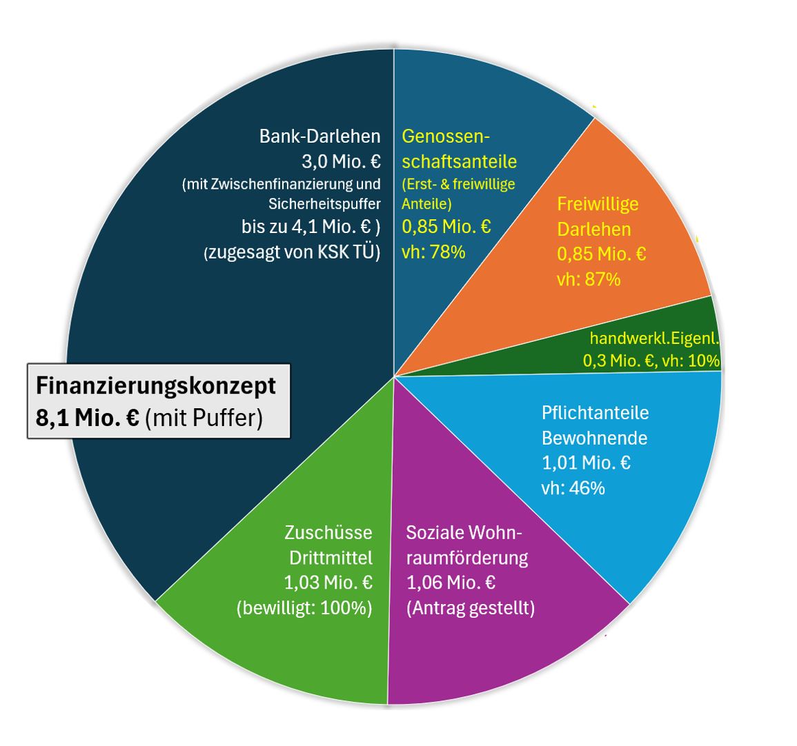 Kosten: ca. 7.6 Mio. € (im Kuchendiagramm mit 0,5 Mio. € Sicherheitspuffer gerechnet). Davon möchten wir möglichst ¼ selber stemmen (gelb beschriftete Kuchenstücke), in Form von Genossenschaftsanteilen (blau), Mitgliederdarlehen (orange) und Handwerks-Eigenleistung (grün).